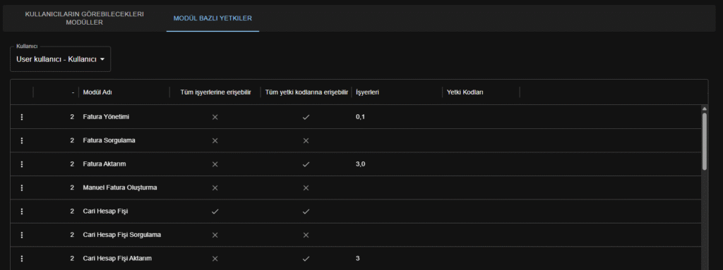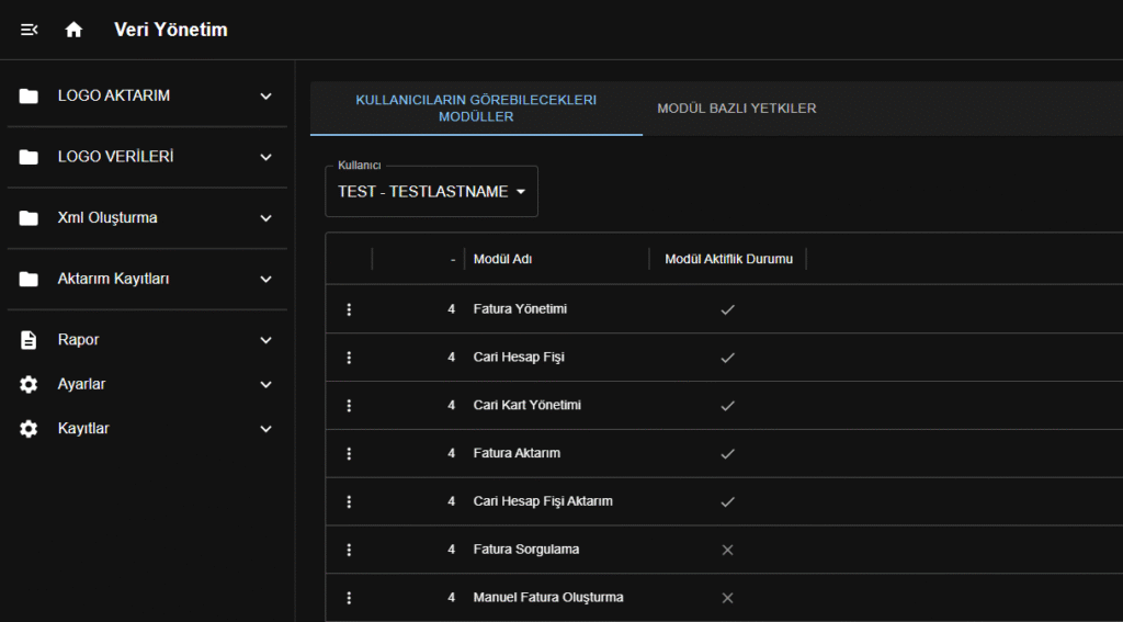 Her kullanıcı için erişebileceği modüller tanımlanabilir. Bu sayede kullanıcılar sadece kendilerine atanmış modülleri görür ve kullanır, gereksiz bilgi karmaşası önlenir.